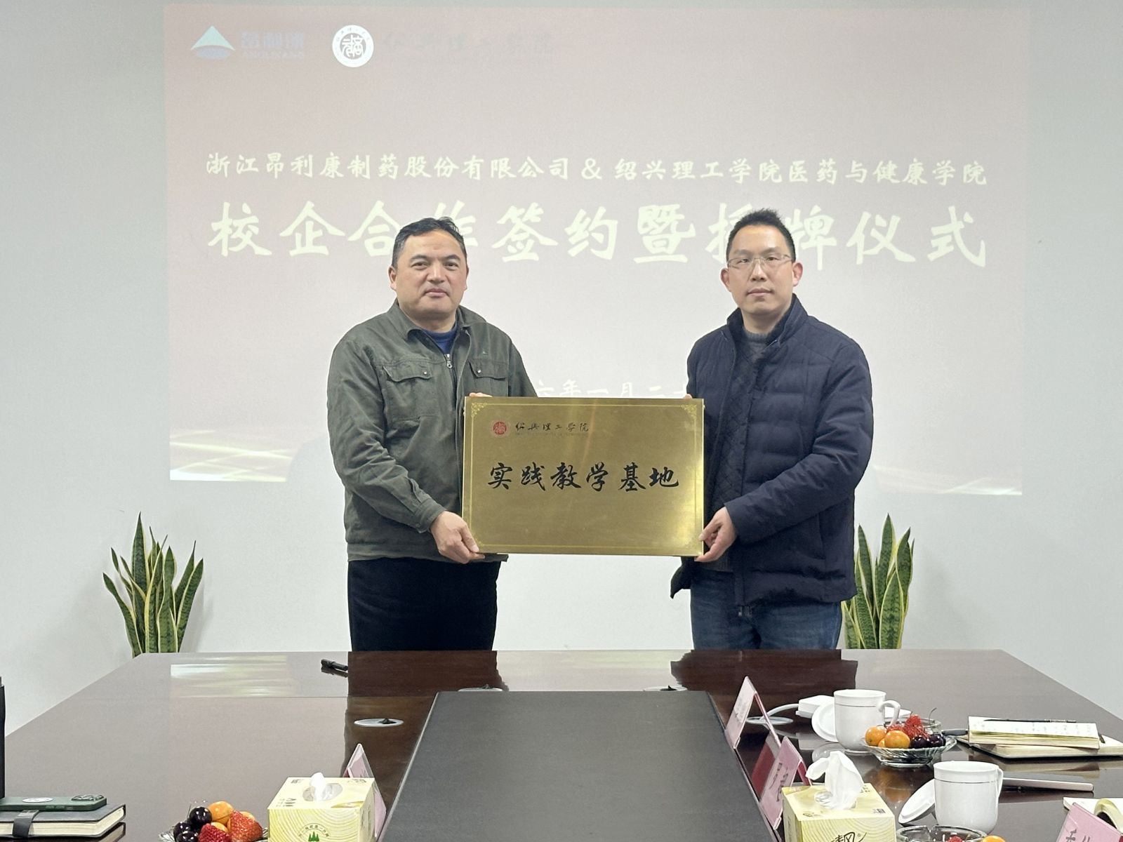1月20日,绍兴理工学院医药与健康学院党委副书记林国旗一行莅临昂利康,就深化产教融合、拓宽人才培养渠道、共建就业实习基地等事宜展开深度洽谈。公司董事长方南平、总经理郑国钢、人事行政总监张子昊热情接待。双方正式签署战略合作框架协议,并举行就业实习基地授牌仪式,标志着校企携手共育医药健康领域应用型人才的合作全面启航。